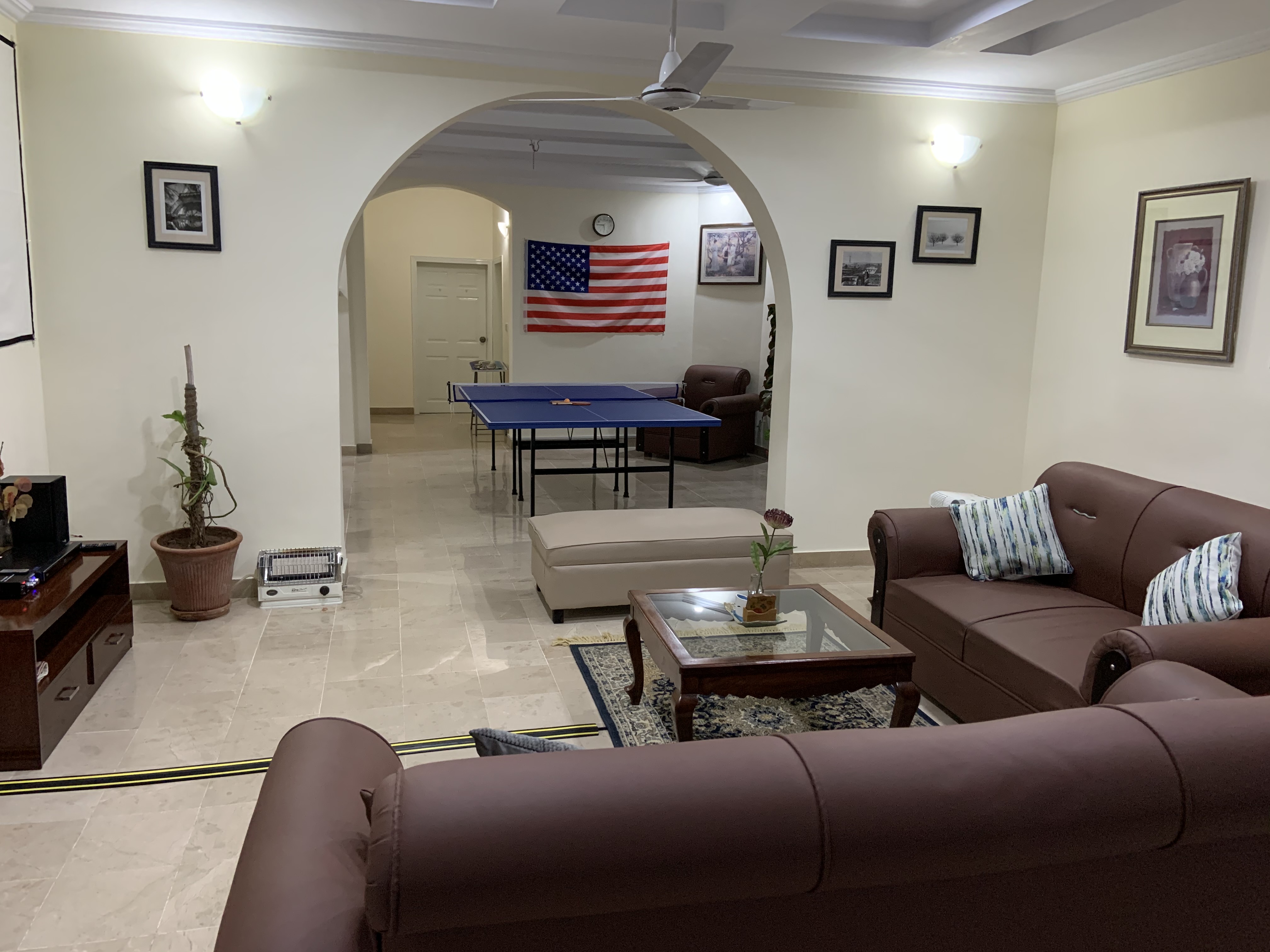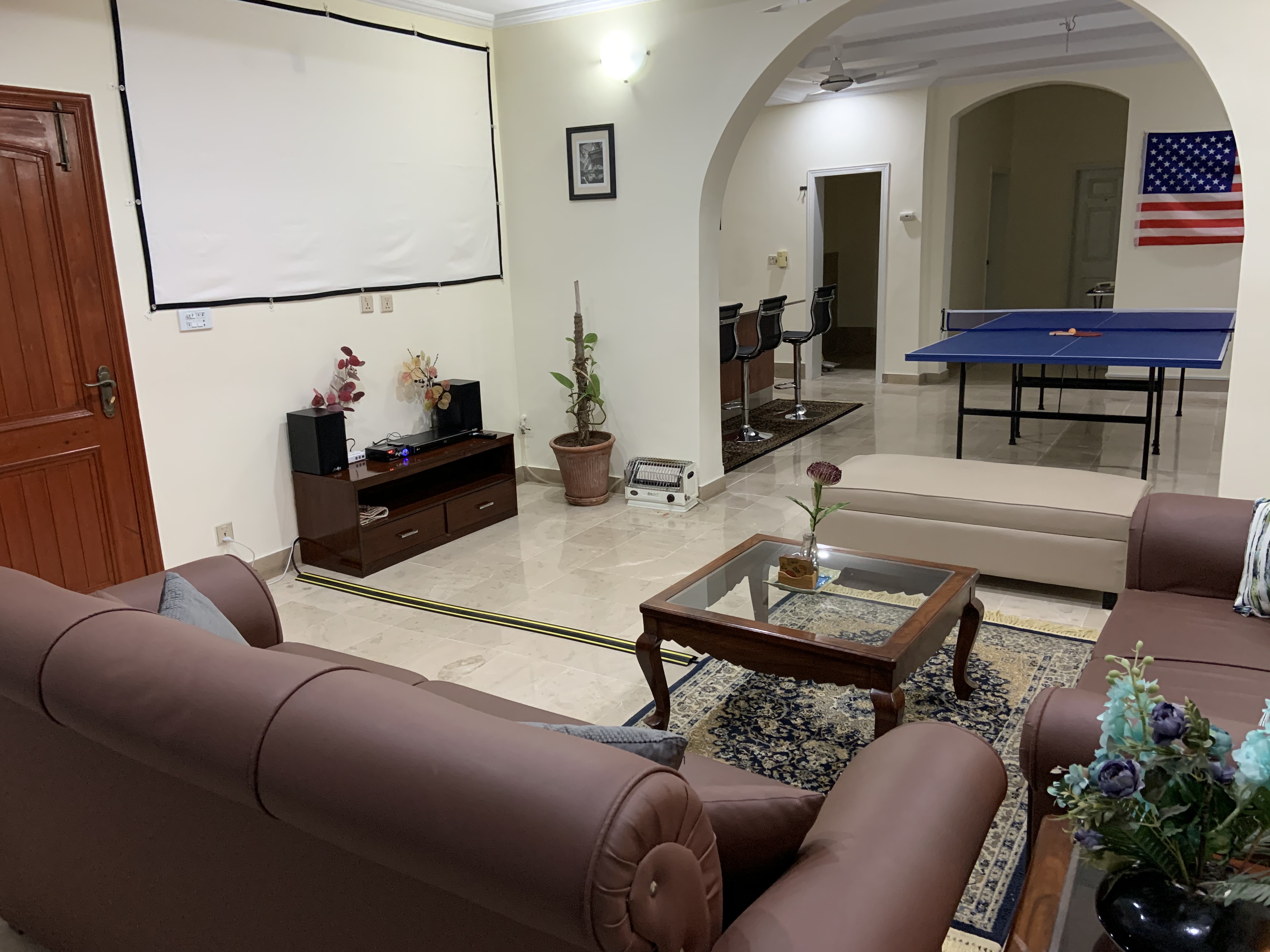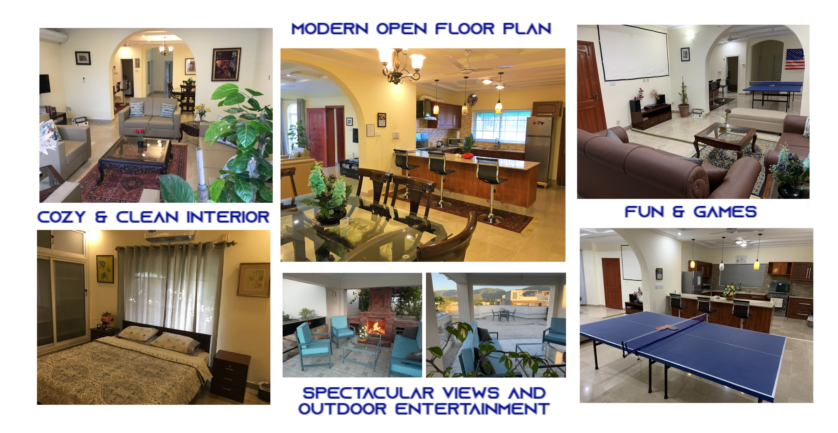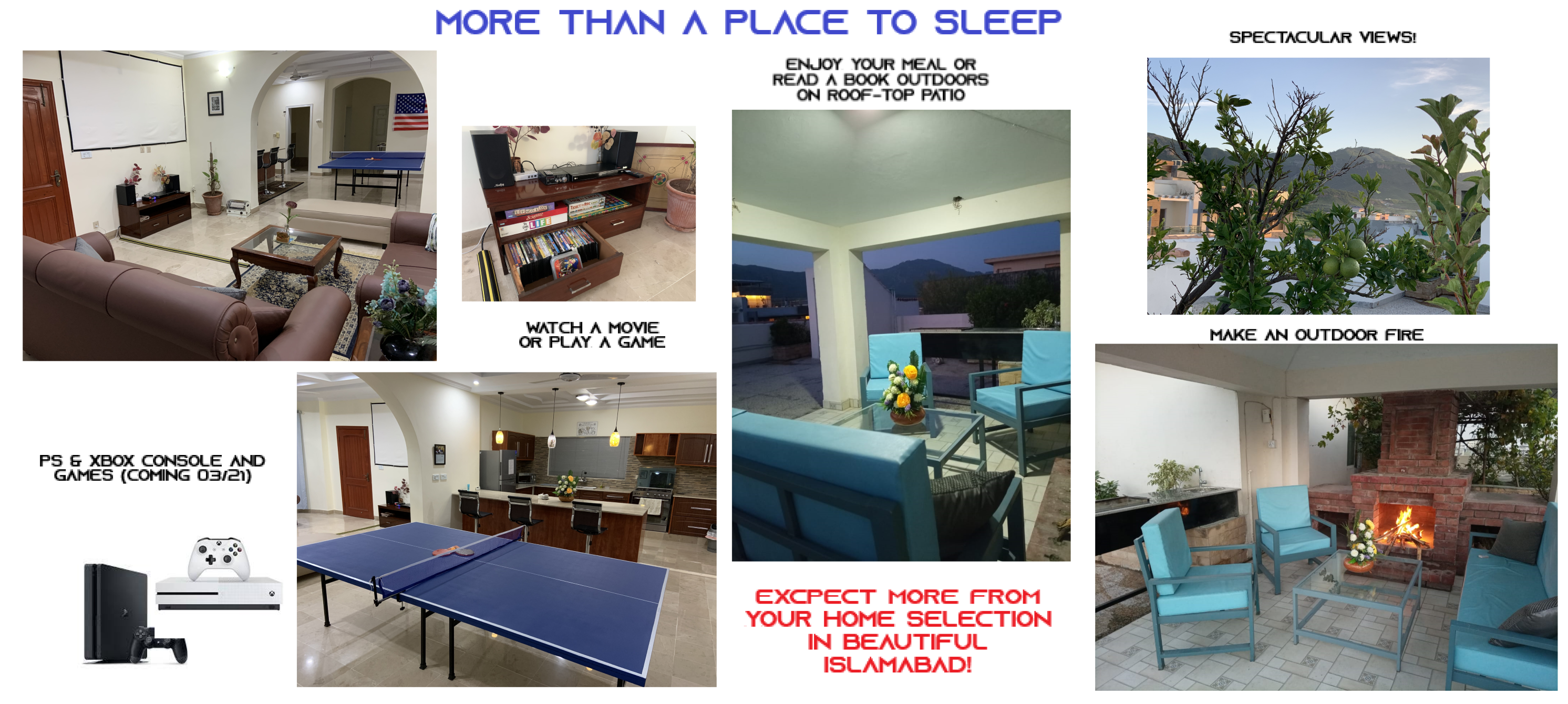 LAYOUT: ====== - 1st Floor: 3 BR, 2.5 Bath, Living, Kitchen, Dining & Laundry Room - 2nd Floor: 2 BR, 2 Bath, Fun & Game Room & 2nd Kitchen - Roof Top: An outdoor garden patio with fireplace, bar-b-q kitchen, and comfortable outdoor furniture BEDROOM/SPACE ASSIGNMENT DETAILS: ================================= - Group comprising 1-8 guests will be assigned the 3 bedrooms, 2.5 bath located on the 1st Floor unit, full access to the “fun & game” room located on the 2nd floor and roof top garden patio (basically everything you see in the pictures of this property) - Group comprising 9 – 14 guests will be assigned additionally up-to 2 bedroom(s) and 2 bath located on the 2nd Floor WHY AREN'T ALL 5 BEDROOMS ASSIGNED? ================================== - Our flexible pricing model accommodates families of all sizes instead of "one-price-fits-all" methodology - Smaller groups should not pay for rooms that they can't use or don't need - Larger groups need more rooms, resulting in higher cost for us to operate, which is why there's extra guest fees after a family of 2 - Closing certain bedrooms (at Owners’ discretion) allows us to directly pass on the saving to you through our flexible pricing model! WHY SHOULD YOU RENT MY HOUSE? ============================= - HOSPITALITY EXPERIENCE & HIGH STANDARDS: I possess 20+ years of executive experience with Marriott, Ritz-Carlton, Melia and many other hospitality organizations. I have applied high standards of accommodation to my house, which differentiates me from other hosts in the area - MORE THAN JUST BEDS: In addition to clean and cozy place to stay, we provide entertainment amenities such as movie projector room, table tennis, board games, outdoor patio, bar-b-q kitchen, breath taking Margala hills views, etc. - PRIVACY: You will have the house to yourself without sharing with the owners or strangers - SPACIOUS AND FULLY EQUIPPED: The house is spacious and full equipped - just bring your luggage – we provide the rest - PEACEFUL & CONVENIENT LOCATION: Close to everything, the house is just ten to twenty-five minutes away from 99% of key Islamabad location, but in a peaceful sector away from the City hustle and bustle - REASONABLY PRICED: My rates are cheaper than renting individual rooms in dated guest houses RATE NEGOTIATION? ================ I have posted the BEST POSSIBLE RATES in order to pass on the savings to you – essentially eliminating the hassle of back and forth rate negotiation. When comparing the prices, just remember that you are not renting individual bedroom (as in a typical hotel or a guesthouse) but an entire house that is clean, cozy, fully equipped, & centrally air-conditioned. My property comfort beats any guesthouse/hotel by a mile and matches or exceeds the cleanliness and quality of any five star hotels in Islamabad GUEST ACCESS: ============ - Group of 1-8: 1st Floor + 2nd Floor Fun and Game Room + Roof-Top Garden - Group of 9-14: 1st Floor + Entire 2nd Floor + Roof-Top Garden You will always have the house to yourself without sharing with Owner or Strangers! FOOD OPTIONS: ============= Breakfast (RS 250/person/meal) and Hire-For-Cooking Service (RS 750/day - you pay for cooking materials/grocery, we provide a chef to cook and do normal daily chores) Guests also have access to a fully equipped self-service kitchen to make their own healthy meals. Additionally, there are several nearby food delivery options (such as Pizza Hut, Paratha Party etc). Housekeeping Manager will provide a list of all those options upon guest arrival. NEED AIRPORT PICKUP: =================== No problem. It can be arranged for you (guest responsible for the pickup cost, which is around USD $20) CAR RENTAL: ========== It can also be arranged with our partner car rental company SECURITY: ======== The house has an on premise guard, providing 24/7 security SUMMARY: ======== With AC in all rooms, high speed Internet/cable, fun & game room with movie theater, outdoor bar-b-q, and much more, this place has it all you need to have a memorable experience. It’s time you expect more when visiting beautiful Islamabad!