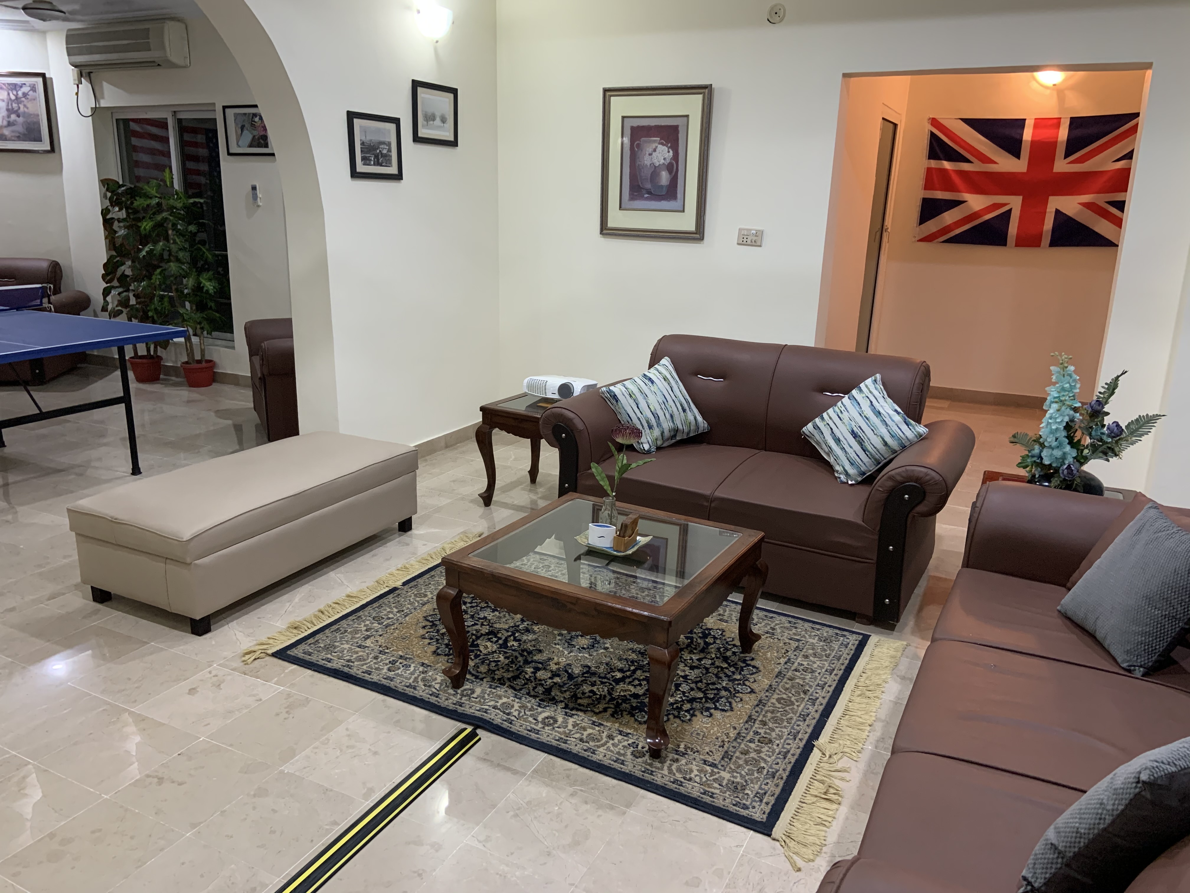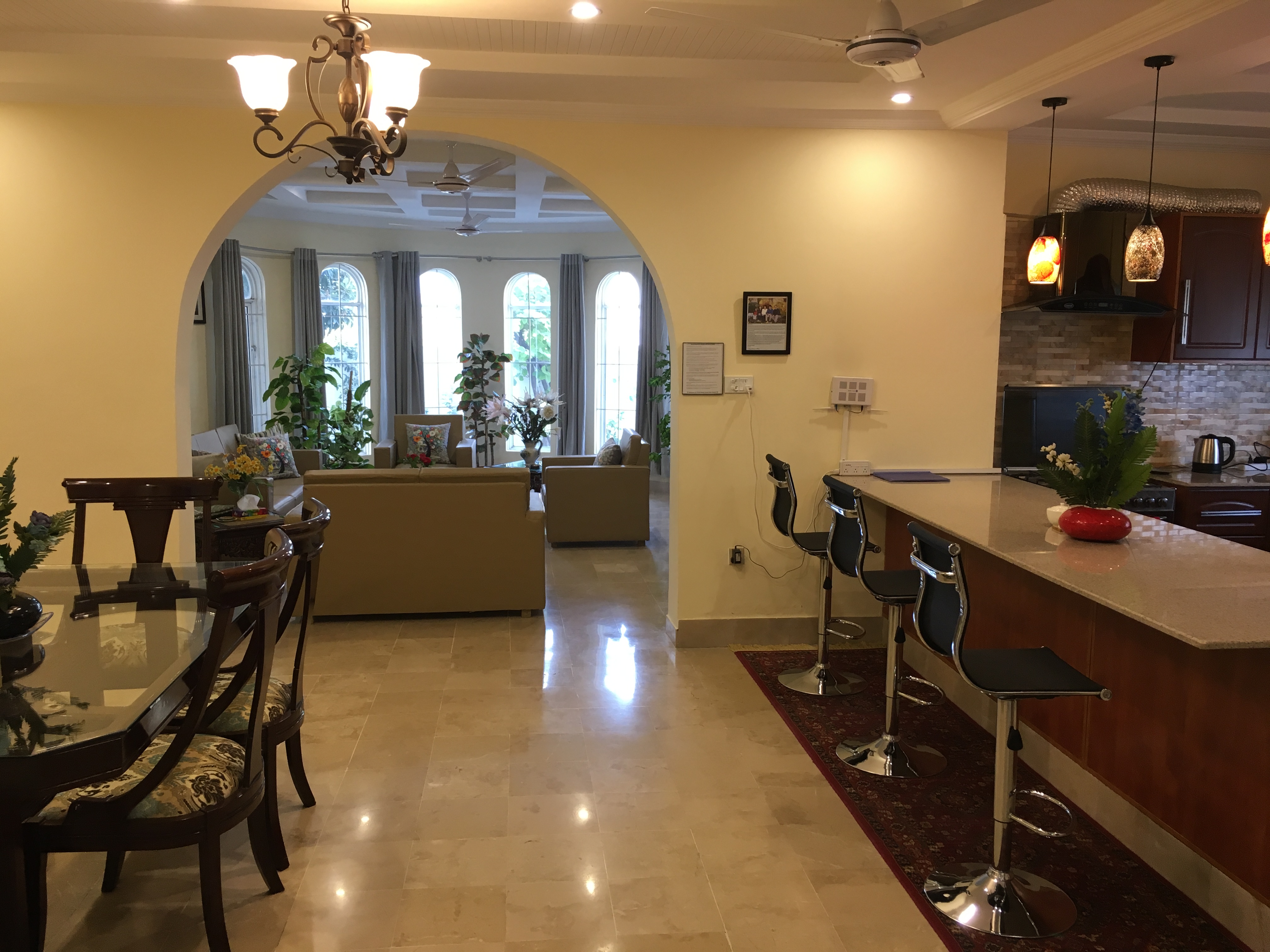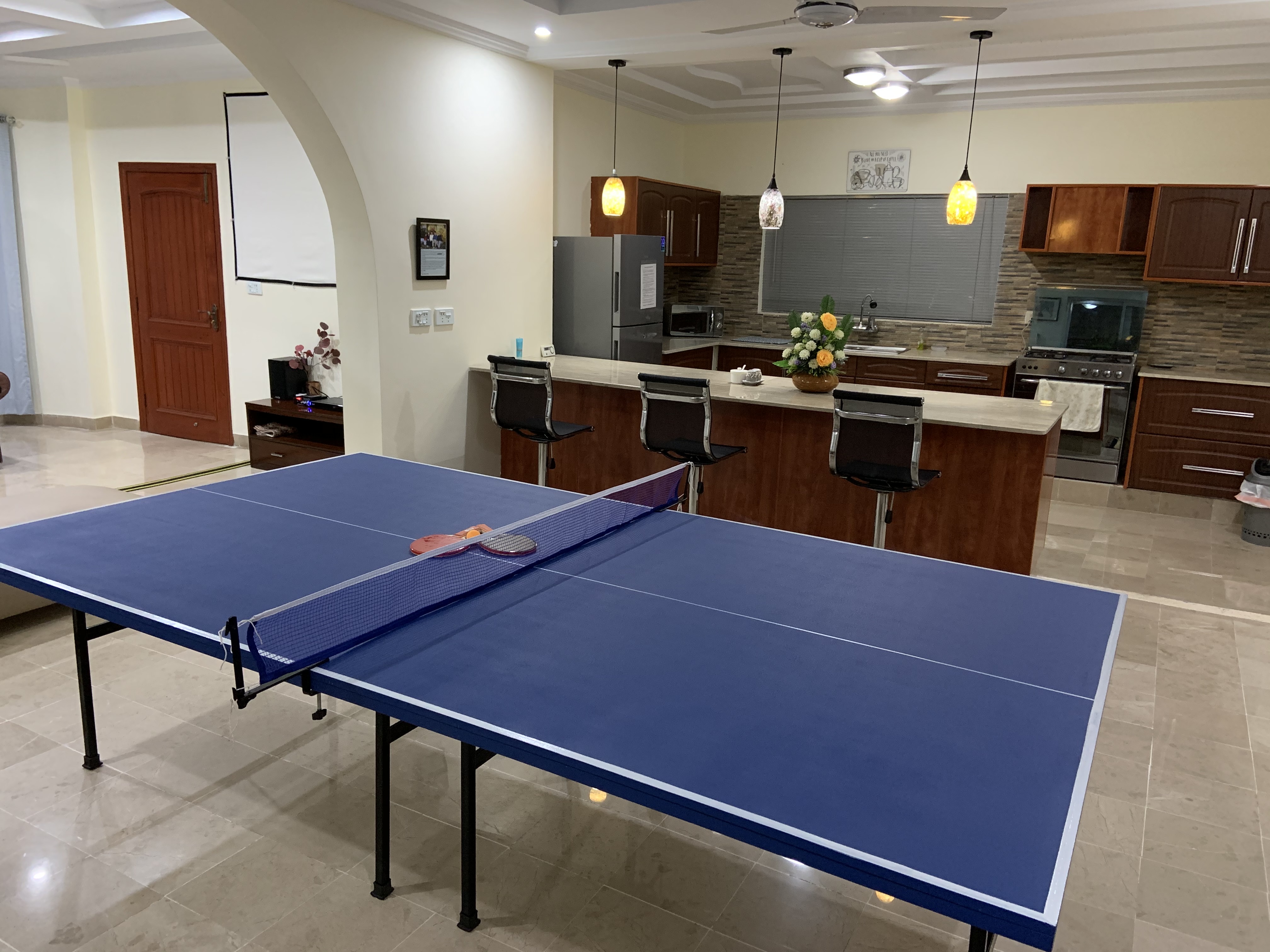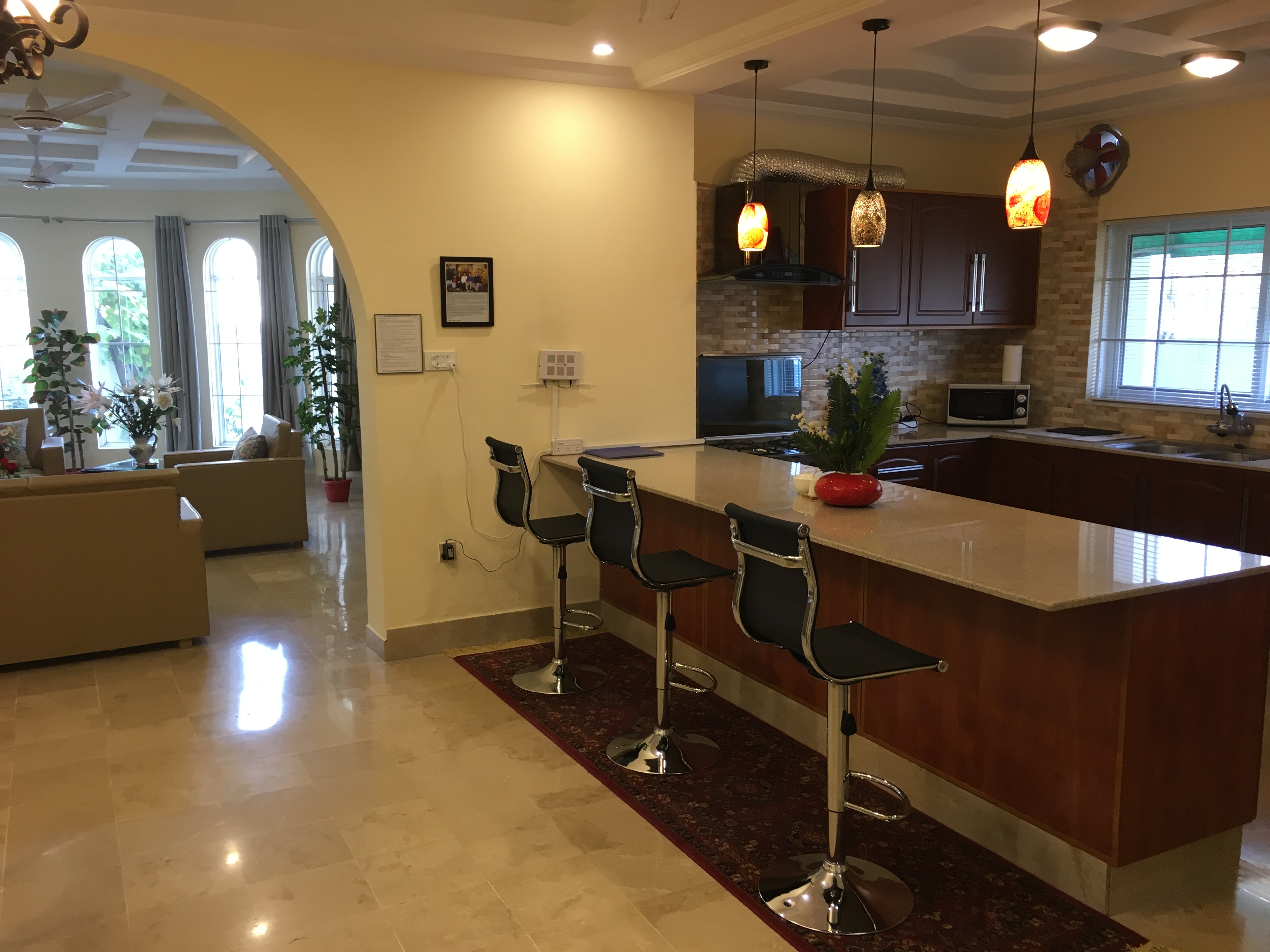 LAYOUT: ====== - 1st Floor: 3 BR, 2.5 Bath, Living, Kitchen, Dining & Laundry Room - 2nd Floor: 2 BR, 2 Bath, Fun & Game Room & 2nd Kitchen - Roof Top: An outdoor garden patio with fireplace, bar-b-q kitchen, and comfortable outdoor furniture BEDROOM/SPACE ASSIGNMENT DETAILS: ================================= - Group comprising 1-8 guests will be assigned the 3 bedrooms, 2.5 bath located on the 1st Floor unit, full access to the “fun & game” room located on the 2nd floor and roof top garden patio (basically everything you see in the pictures of this property) - Group comprising 9 – 14 guests will be assigned additionally up-to 2 bedroom(s) and 2 bath located on the 2nd Floor WHY AREN'T ALL 5 BEDROOMS ASSIGNED? ================================== - Our flexible pricing model accommodates families of all sizes instead of "one-price-fits-all" methodology - Smaller groups should not pay for rooms that they can't use or don't need - Larger groups need more rooms, resulting in higher cost for us to operate, which is why there's extra guest fees after a family of 2 - Closing certain bedrooms (at Owners’ discretion) allows us to directly pass on the saving to you through our flexible pricing model! WHY SHOULD YOU RENT MY HOUSE? ============================= - HOSPITALITY EXPERIENCE & HIGH STANDARDS: I possess 20+ years of executive experience with Marriott, Ritz-Carlton, Melia and many other hospitality organizations. I have applied high standards of accommodation to my house, which differentiates me from other hosts in the area - MORE THAN JUST BEDS: In addition to clean and cozy place to stay, we provide entertainment amenities such as movie projector room, table tennis, board games, outdoor patio, bar-b-q kitchen, breath taking Margala hills views, etc. - PRIVACY: You will have the house to yourself without sharing with the owners or strangers - SPACIOUS AND FULLY EQUIPPED: The house is spacious and full equipped - just bring your luggage – we provide the rest - PEACEFUL & CONVENIENT LOCATION: Close to everything, the house is just ten to twenty-five minutes away from 99% of key Islamabad location, but in a peaceful sector away from the City hustle and bustle - REASONABLY PRICED: My rates are cheaper than renting individual rooms in dated guest houses RATE NEGOTIATION? ================ I have posted the BEST POSSIBLE RATES in order to pass on the savings to you – essentially eliminating the hassle of back and forth rate negotiation. When comparing the prices, just remember that you are not renting individual bedroom (as in a typical hotel or a guesthouse) but an entire house that is clean, cozy, fully equipped, & centrally air-conditioned. My property comfort beats any guesthouse/hotel by a mile and matches or exceeds the cleanliness and quality of any five star hotels in Islamabad GUEST ACCESS: ============ - Group of 1-8: 1st Floor + 2nd Floor Fun and Game Room + Roof-Top Garden - Group of 9-14: 1st Floor + Entire 2nd Floor + Roof-Top Garden You will always have the house to yourself without sharing with Owner or Strangers! FOOD OPTIONS: ============= Breakfast (RS 250/person/meal) and Hire-For-Cooking Service (RS 750/day - you pay for cooking materials/grocery, we provide a chef to cook and do normal daily chores) Guests also have access to a fully equipped self-service kitchen to make their own healthy meals. Additionally, there are several nearby food delivery options (such as Pizza Hut, Paratha Party etc). Housekeeping Manager will provide a list of all those options upon guest arrival. NEED AIRPORT PICKUP: =================== No problem. It can be arranged for you (guest responsible for the pickup cost, which is around USD $20) CAR RENTAL: ========== It can also be arranged with our partner car rental company SECURITY: ======== The house has an on premise guard, providing 24/7 security SUMMARY: ======== With AC in all rooms, high speed Internet/cable, fun & game room with movie theater, outdoor bar-b-q, and much more, this place has it all you need to have a memorable experience. It’s time you expect more when visiting beautiful Islamabad!